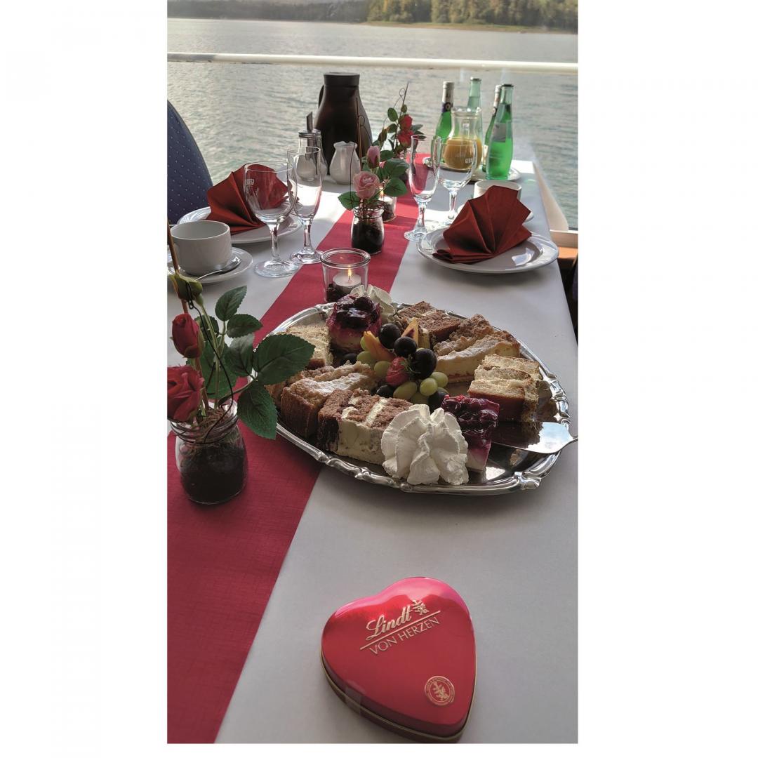 Kaffeegedeck am festlicher Kaffeetafel, 4 Stück Kuchen, Piccolo und Orangensaft sowie Kaffee, Tee